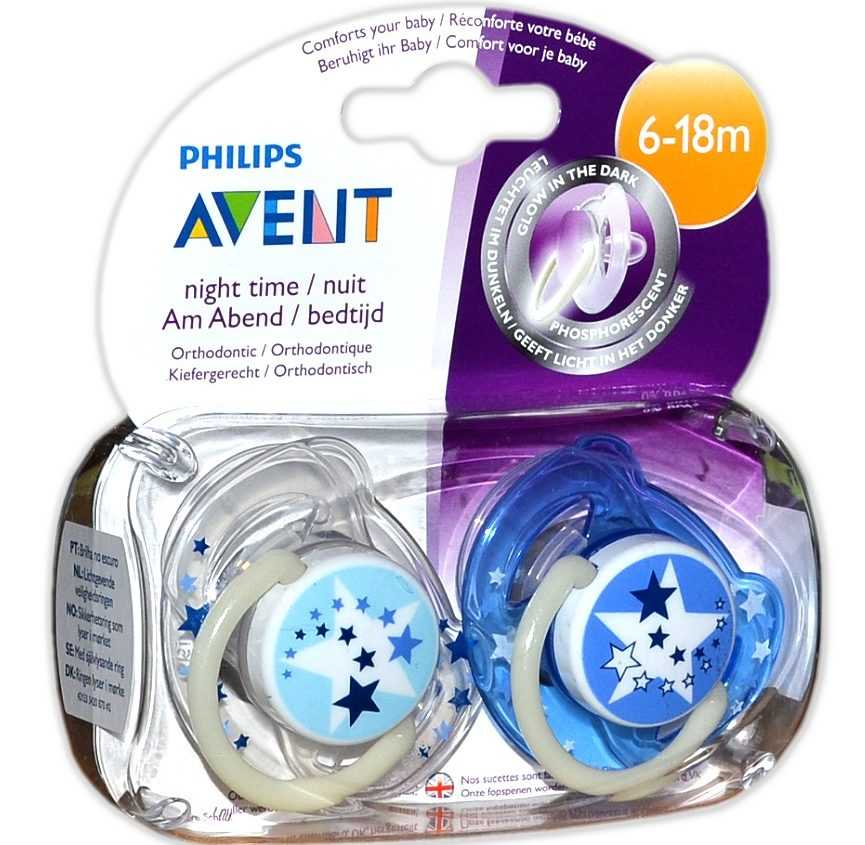 Philips AVENT поставляется в комплекте, в который входят 2 ортодонтические соски. Они рассчитаны на возраст от 6 до 18 месяцев. Их особенность – светящееся в темноте кольцо–держатель, благодаря которому можно быстро отыскать пустышку ночью, не включая свет. Материал – прочный силикон. Он не имеет вкуса и запаха, не вызывает аллергии, поскольку не вступает в реакцию со слюной.