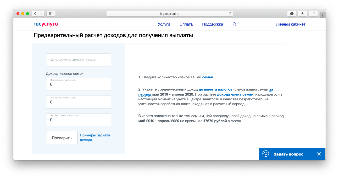 Рассчитать, подходит ли семья под критерии выплат, можно на Госуслугах своего региона: