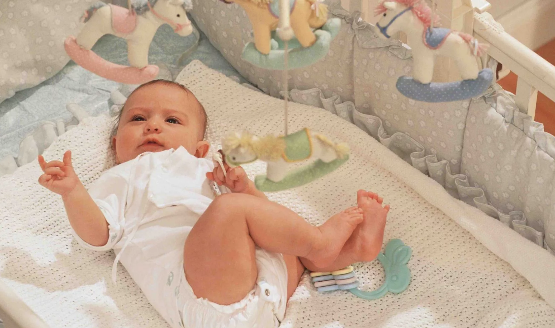 Малыш начинает интересоваться лицами, особенно маминым. Малыша в 3 месяца привлекают подвесные игрушки, которые висят над кроватью.