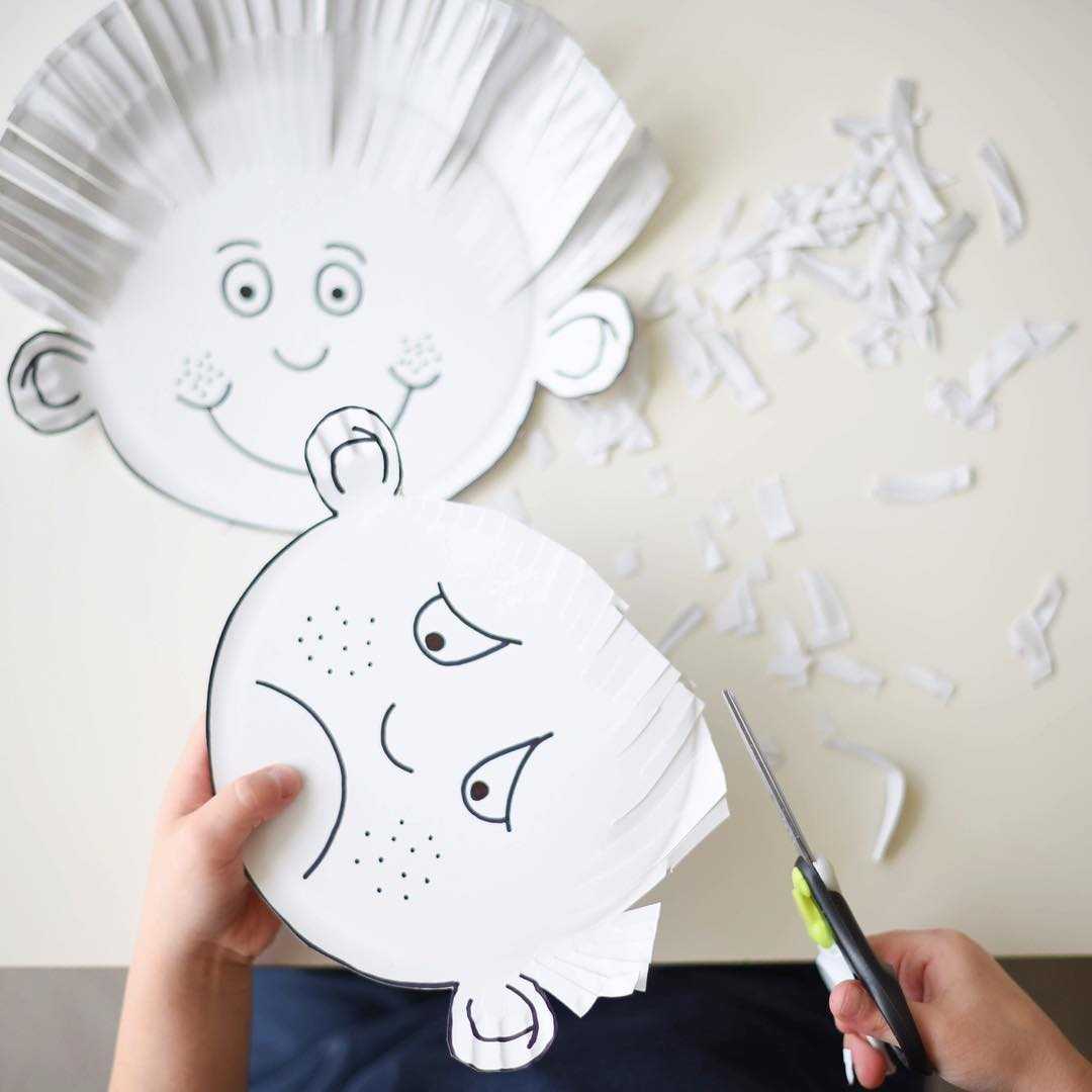 Играть в парикмахера, развивая мелкую моторику рук, можно и с помощью бумажной тарелки. Идея та же: нарисовать рожицу и «сделать» волосы, затем вручить ребенку ножницы и предложить сделать стрижку.
