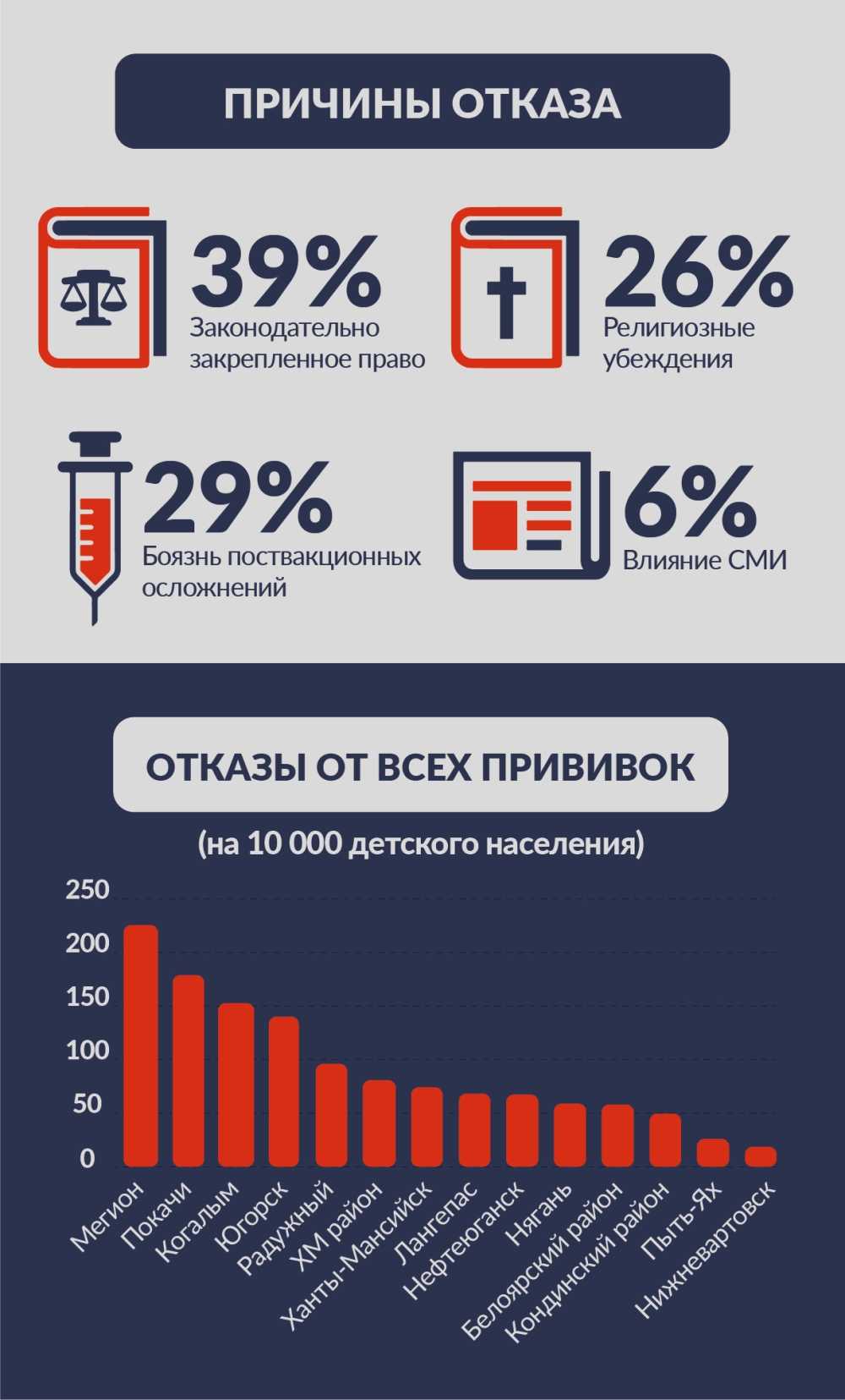 Врачи подчеркивают: чтобы не привитый ребенок чувствовал себя комфортно и не подхватил инфекцию, должно быть привито не меньше 95-98% населения. В Югре не во всех городах достигнут этот показатель. Например в Мегионе привито 83% от коклюша. З9% югорчан отказались от прививок по личным убеждениям, мотивируя свой отказ законодательно закрепленным правом, 29% — боятся поствакционных последствий, 26% — сослались на влияние СМИ, 6% — по религиозным убеждениям.