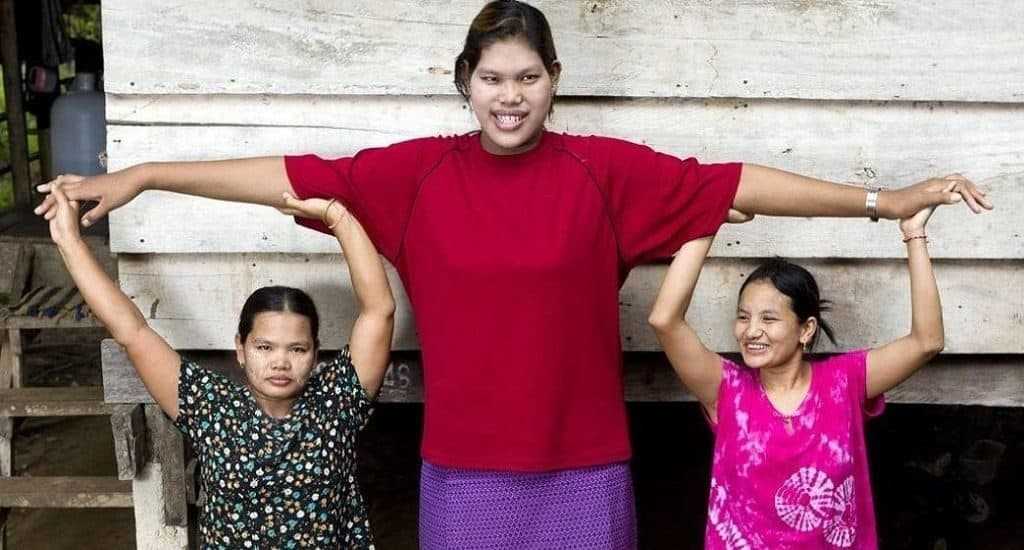 Мали Дуангди (Таиланд) – самая высокая в Таиланде среди девушек и ее рост 208см. Сведения о ней занесены в Книгу рекордов Гиннесса. Причина высокого роста и большого веса (130кг) в опухоли гипофиза. Она же стала причиной потери зрения. Операция в ее случае невозможна из-за расположения опухоли, а поддерживать девушку необходимым лечением у бедной семьи нет возможности.