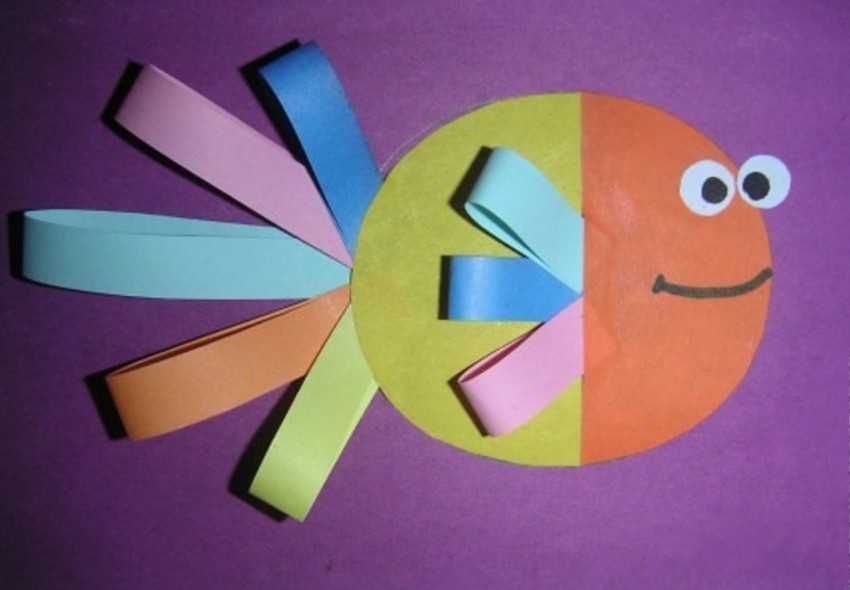 На квадратиках тонкой разноцветной бумаги рисуется контур рыбок: эллипс с треугольником в виде хвостика; вырезается. Тёмным карандашом или фломастером обозначается голова и глаз. Нанести клей на тыльную сторону и в свободном порядке прилепить рыбок.
