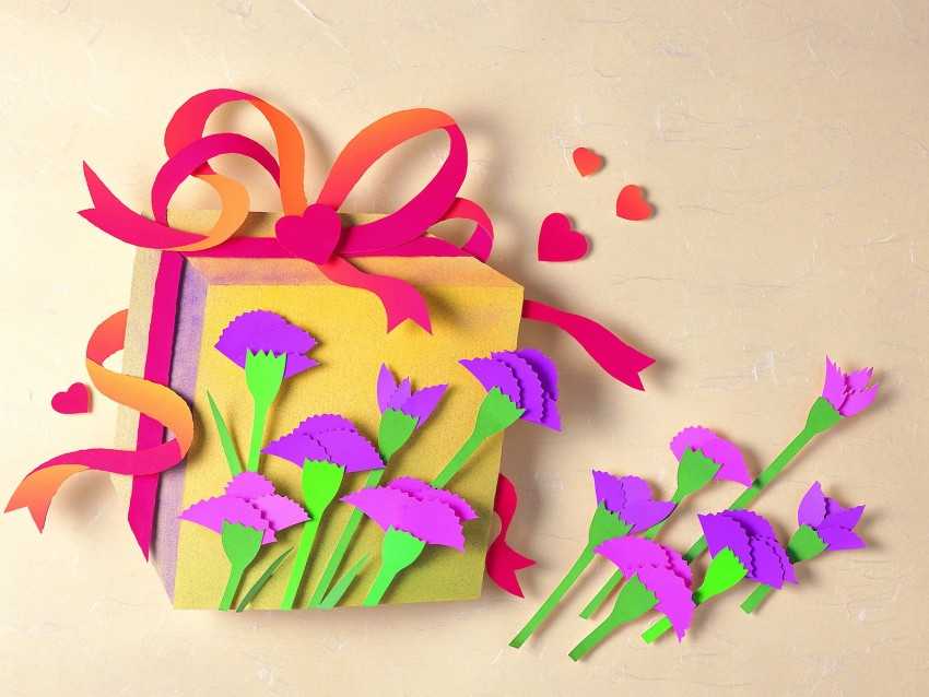 Для открытки потребуется крепкий картон нейтрального цвета. На него крепится ваза из бархатной или фольгированной бумаги. Самое кропотливое в этой работе – вырезать формы цветов, поэтому совместный труд в этом действии очень уместен.