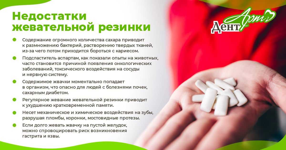 - Содержимое жвачки моментально попадает в организм, что опасно для людей с болезнями почек, сахарным диабетом.