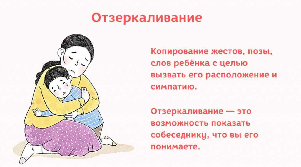 Следующий способ — отзеркаливание. В психологии так называют копирование жестов, позы, слов собеседника с целью вызвать его расположение и симпатию. Это возможность показать ребёнку вербально и невербально, что вы его понимаете, сопереживаете ему.