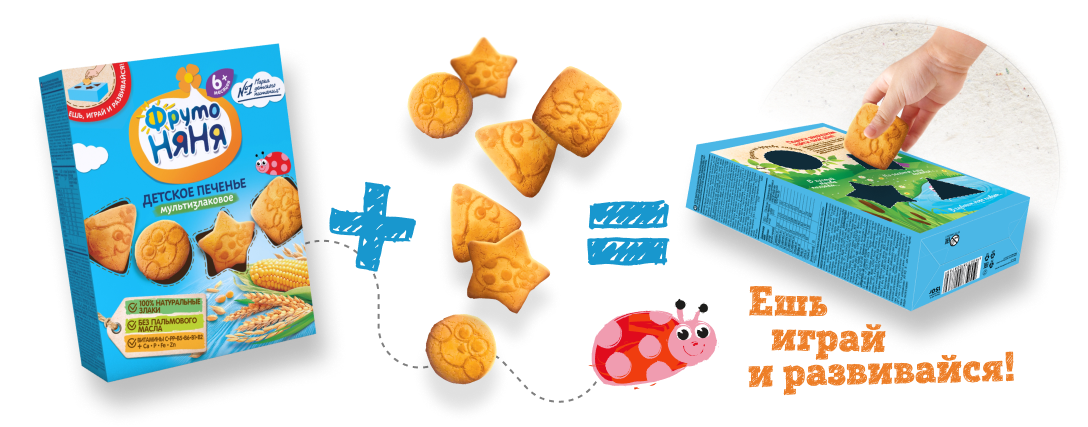 ФрутоНяня подходит к изготовлению собственной продукции не только исходя из натуральности и тщательного контроля над качеством, но и с креативностью. К примеру, посмотрите на это печенье. Это не только здоровый перекус, но и целая игра! Какое интересное оформление! Упаковка печенья как коробка игрушки-сортера!