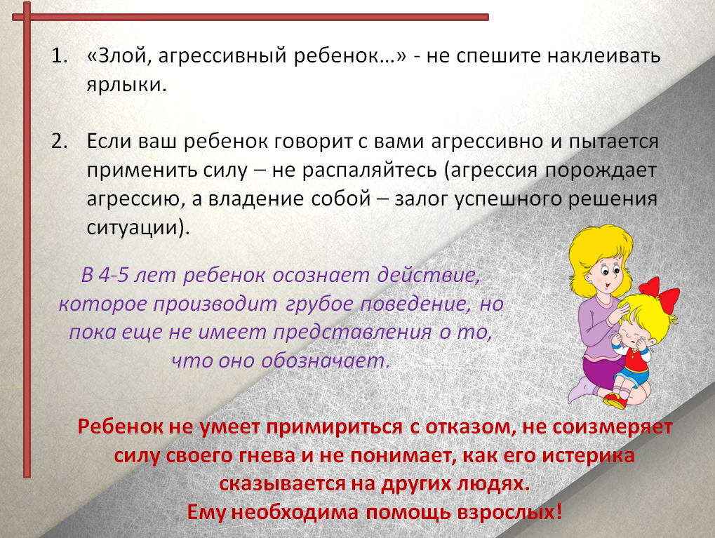 Если истерики у ребёнка продолжаются и в старшем возрасте, то это является серьезным сигналом того, что у него имеются проблемы с нервной системой. Если поведение малыша во время истерики носит агрессивный характер, он пытается навредить себе и окружающим, неожиданно задерживает дыхание и теряет сознание, то стоит обратиться за помощью к неврологу, он подскажет, что делать в такой ситуации, назначит адекватное лечение.