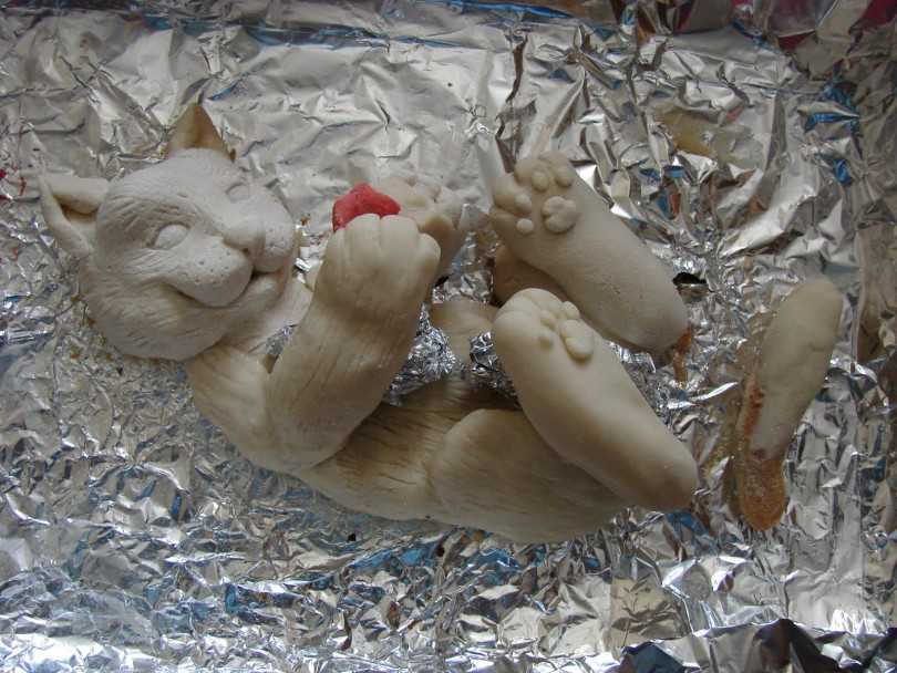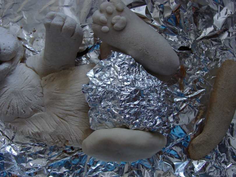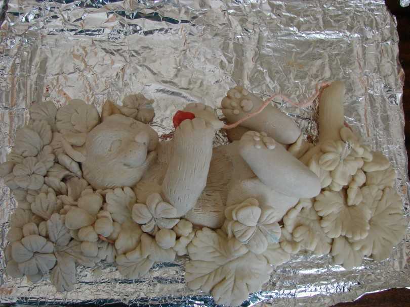 - Если предполагается сделать объемный элемент, то в качестве основы используйте фольгу. Ее следует свернуть в желаемую форму, которая в последующем «обтягивается» пластичной смесью. Таким образом не сможет образоваться плесень на творении, и сувенир равномерно просохнет.