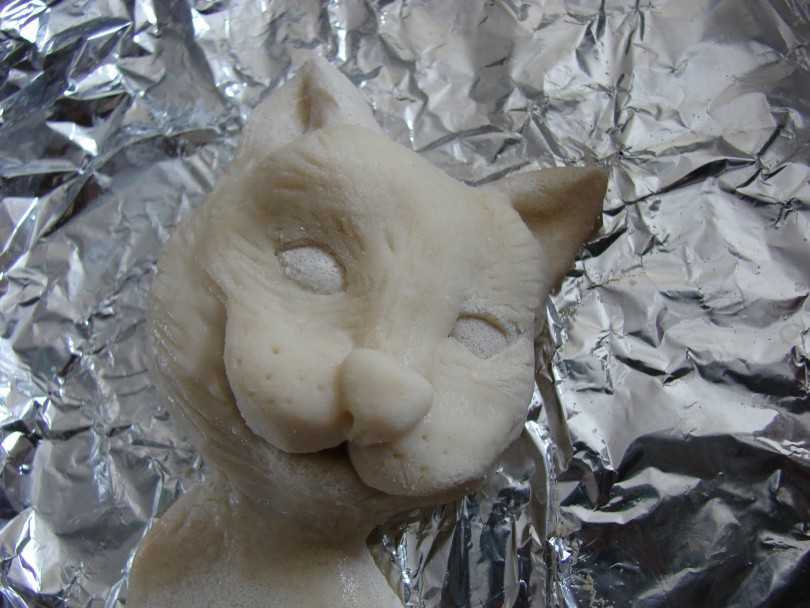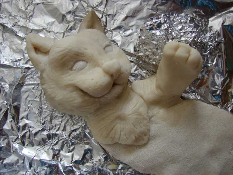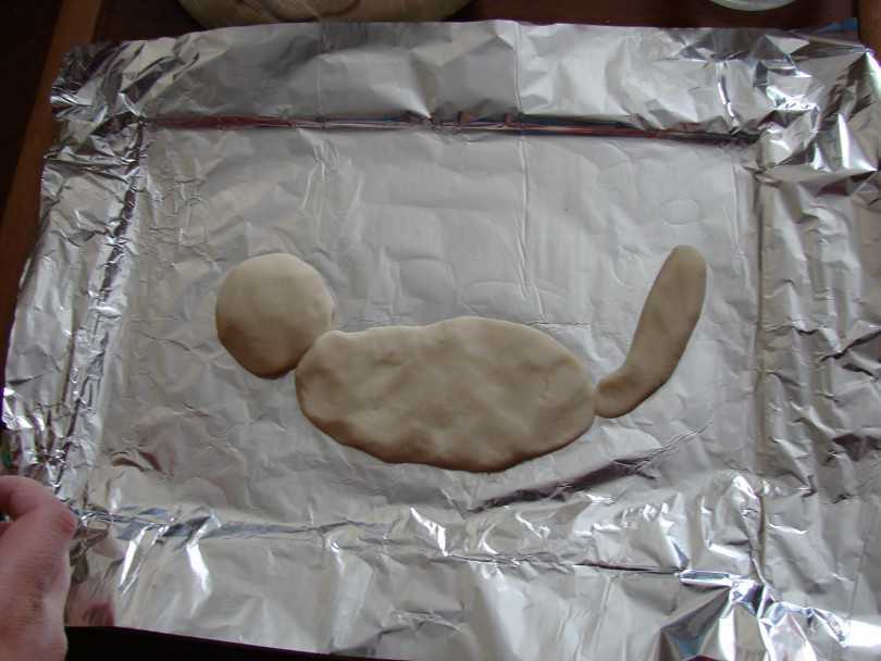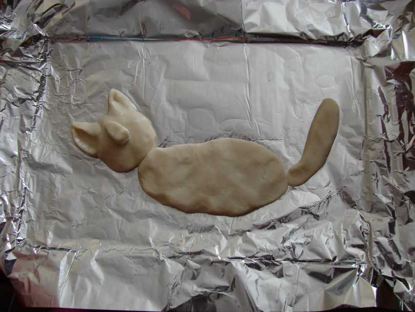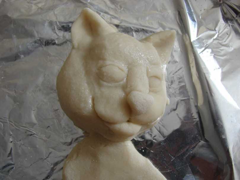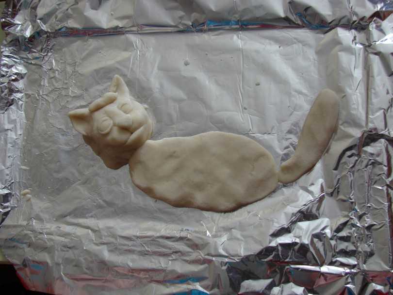 Лепить или вырезать фигурки можно сразу на противне. Противень предварительно следует увлажнить водой, в таком случае между изделием и поверхностью противня не образуются пузыри, следовательно , поверхность изделия будет ровной и устойчивой.