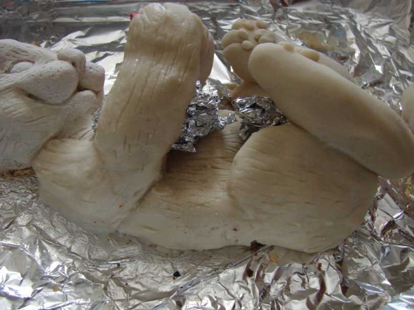 - Формируем лапки и крепим их у основания поделки.