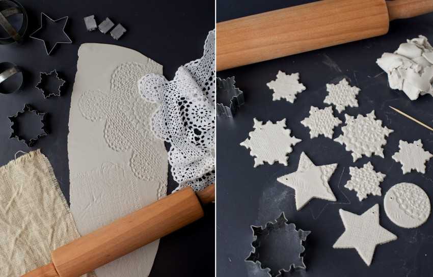 - В качестве стек используйте пилочки для маникюра, ножницы (ими можно делать острые иголочки у ежика), вилку или чайную ложку. Интересного узора на поверхности позволит добиться припечатанная поверх ажурная ткань или кружево.