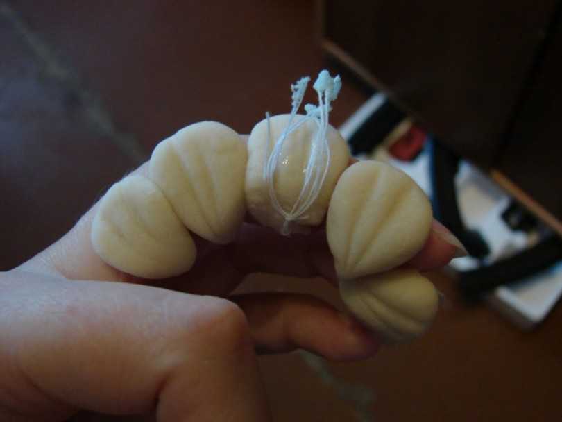 - Через чесночницу пропускать продукт, получая много тонких полосок. Скручивая их спиралью и отрезая по кусочку, закрепить по ручке с помощью клея.