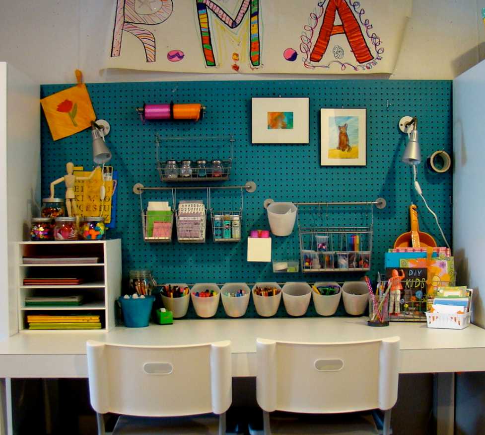 Детям понравится такой столик, даже если у них разные интересы — например, если один увлекается рисованием, а другой любит лепить из пластилина. Полки на стенах помогут сэкономить пространство и сохранять порядок и чистоту.