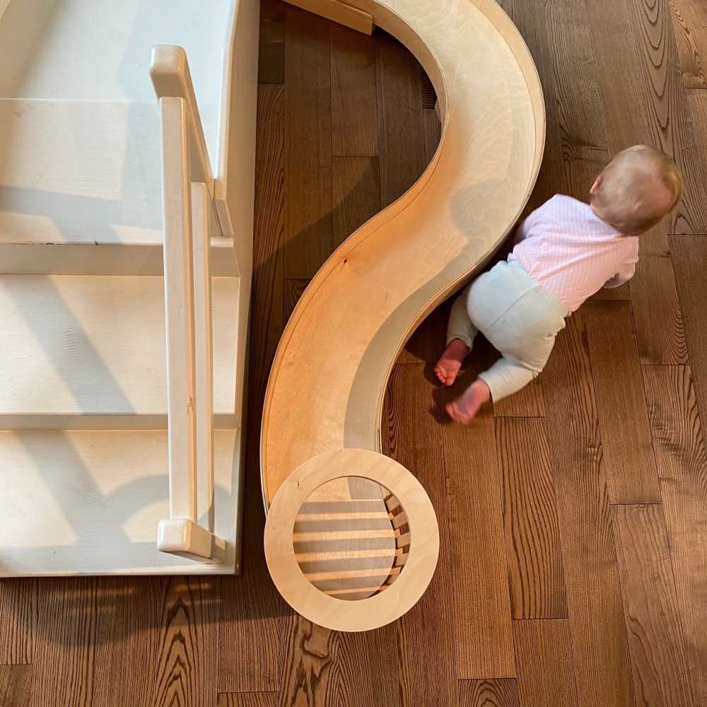 Если есть возможность, поставьте дома ступеньки с поручнями или прикрепите одну перекладину к стене. Придерживаясь, ребёнок будет пытаться встать на ножки самостоятельно. Ещё вариант для тренировки движений — трек для мяча с корзиной: малыш закидывает мяч в корзину, мяч катится по треку, ребёнок ползёт ( а позже идёт) к концу трека, берёт мяч и возвращает в корзину.