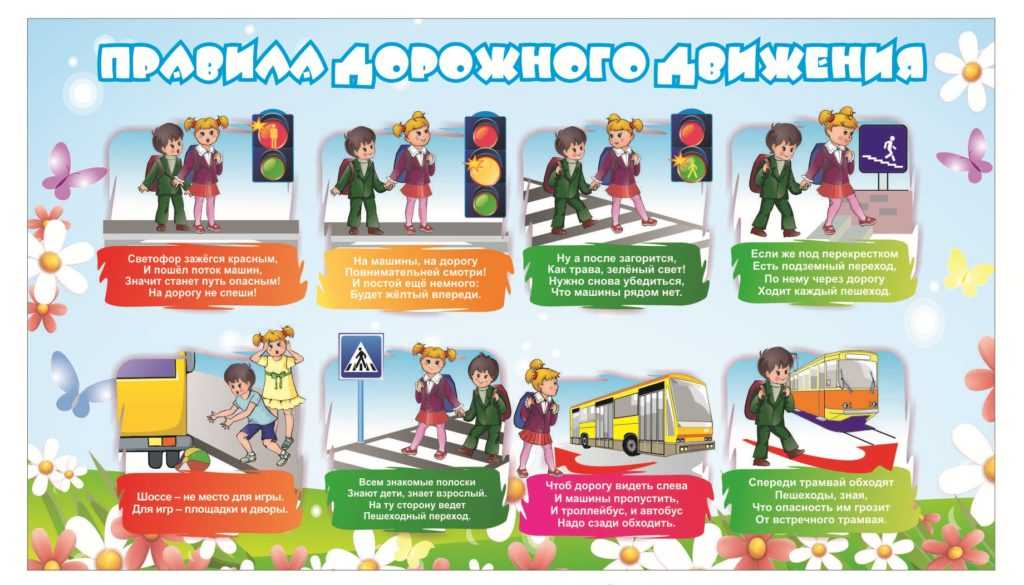 (переходить дорогу только на зеленый цвет, не бегать переходя дорогу, не играть на проезжей части)
