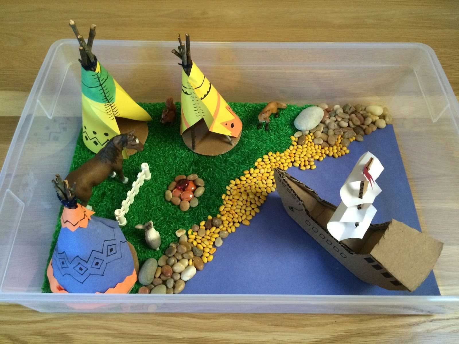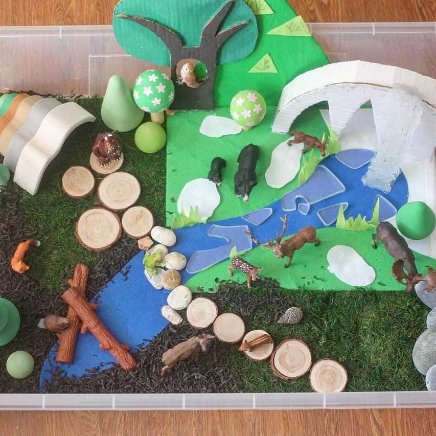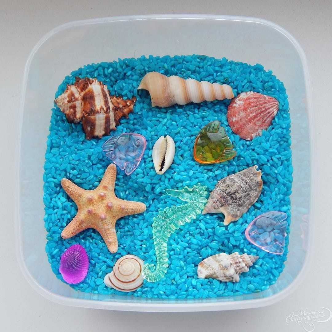 Песок, манка, аквагрунт, вода подойдут для игры с морскими животными. Рис или макароны, покрашенные в зеленый цвет, будут отличной ареной для игры с животными и насекомыми. Камни, песок, сахар-рафинад и крупные макароны пригодятся для игры в стройку. Можно сделать сезонные коробки: например, солома, желтые и красные листья, желуди, каштаны отлично передадут настроение осени. А яркие цветы, камни, трава и зеленые листья подходят для весенней и летней коробки.