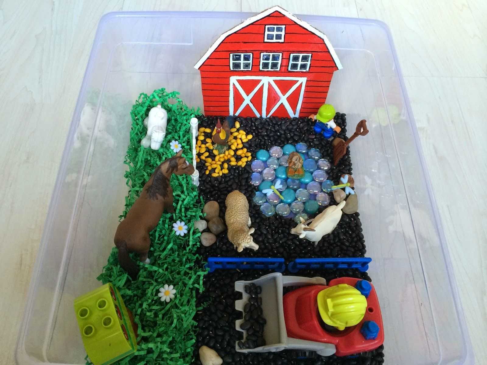 Для детей постарше замечательно будет соединить тематические игры с сенсорными опытом. Со снегом, ледяными кубиками, ледяными «айсбергами» (замороженными в баночках из-под сметаны) можно поиграть в Северный или Южный полюс, Новый год, фабрику мороженого. С фасолью разных цветов, травой — в ферму или зоопарк. Гальку, черную фасоль, черные макароны (покрашенные пищевыми красителями), какао, молотый кофе можно использовать для игры в огород, в раскопки окаменелостей.