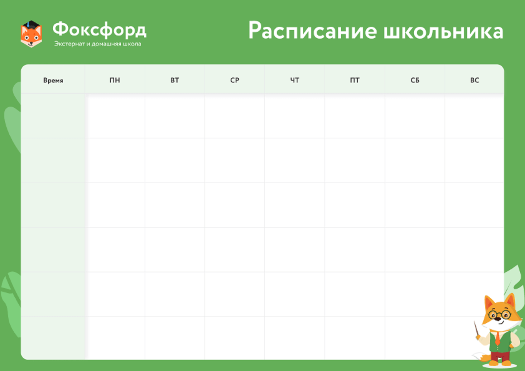 Мы дарим вам красочный шаблон для составления расписания. Вы можете его скачать в высоком качестве, распечатать, заполнить и повесить на стену.