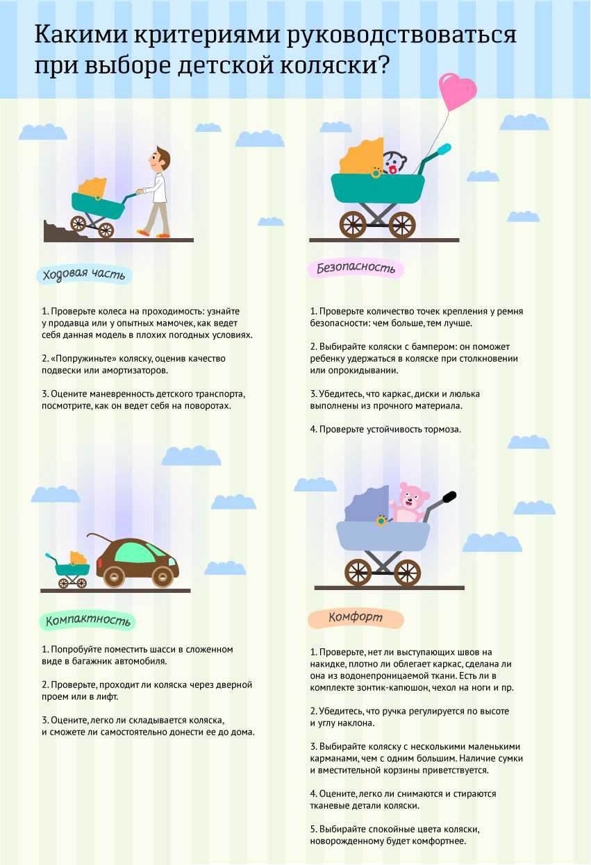 При выборе прогулочной коляски необходимо отталкиваться от ваших требований, и поставленных задач. Для летней коляски важнее небольшой вес и продуваемые материалы, для зимней – хорошая проходимость и управляемость в сложных дорожных условиях. Вы можете выбрать коляску через интернет, но перед покупкой лучше найти ее в магазине, и покатать-потрогать. Еще лучше взять с собой ребенка – чтобы будущий обладатель и пассажир коляски мог оценить ее удобство. Учтите, что на ровном полу магазина и асфальте с ямами она может вести себя по-разному. Отнеситесь к выбору внимательно, ведь коляска выбирается не на один день.