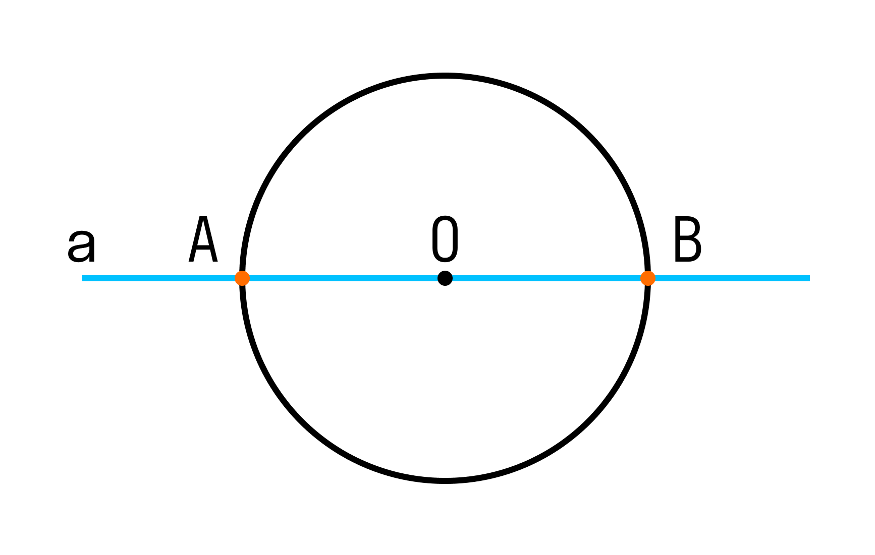 На рисунке прямая a проходит через центр окружности (точку О) и пересекает ее в двух точках А и В, которые являются концами диаметра АВ данной окружности.