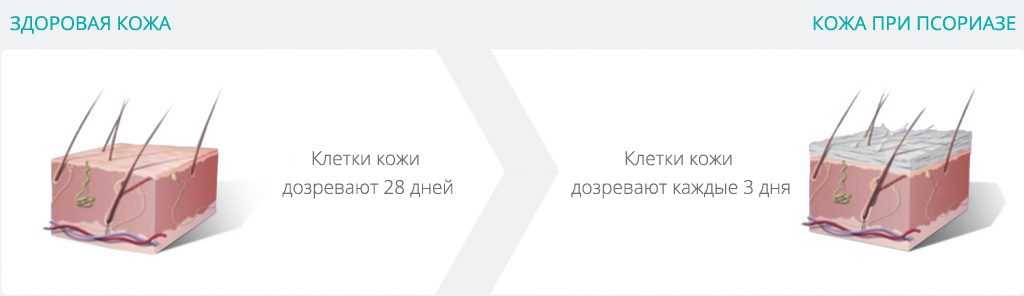 Клетки нашей кожи обновляются каждые 3-4 недели, но при псориазе этот процесс нарушается — происходит «перепроизводство» клеток и кожа обновляется слишком быстро, каждые 3-7 дней. Именно с излишним возникновением новых клеток и связана потеря кожей влаги, накопление бляшек и фактическое разрушение защитного кожного барьера при псориазе.