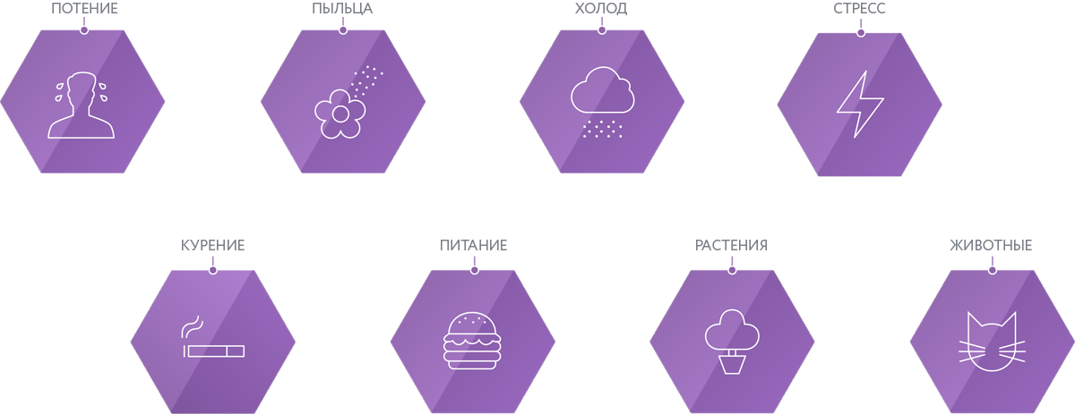 Обострения атопического дерматита чаще всего вызваны физической реакцией на определённые продукты питания, растения, ткань или животных. Другие известные возбудители — стресс, курение, потливость, пыльца и слишком сухие или влажные погодные условия.