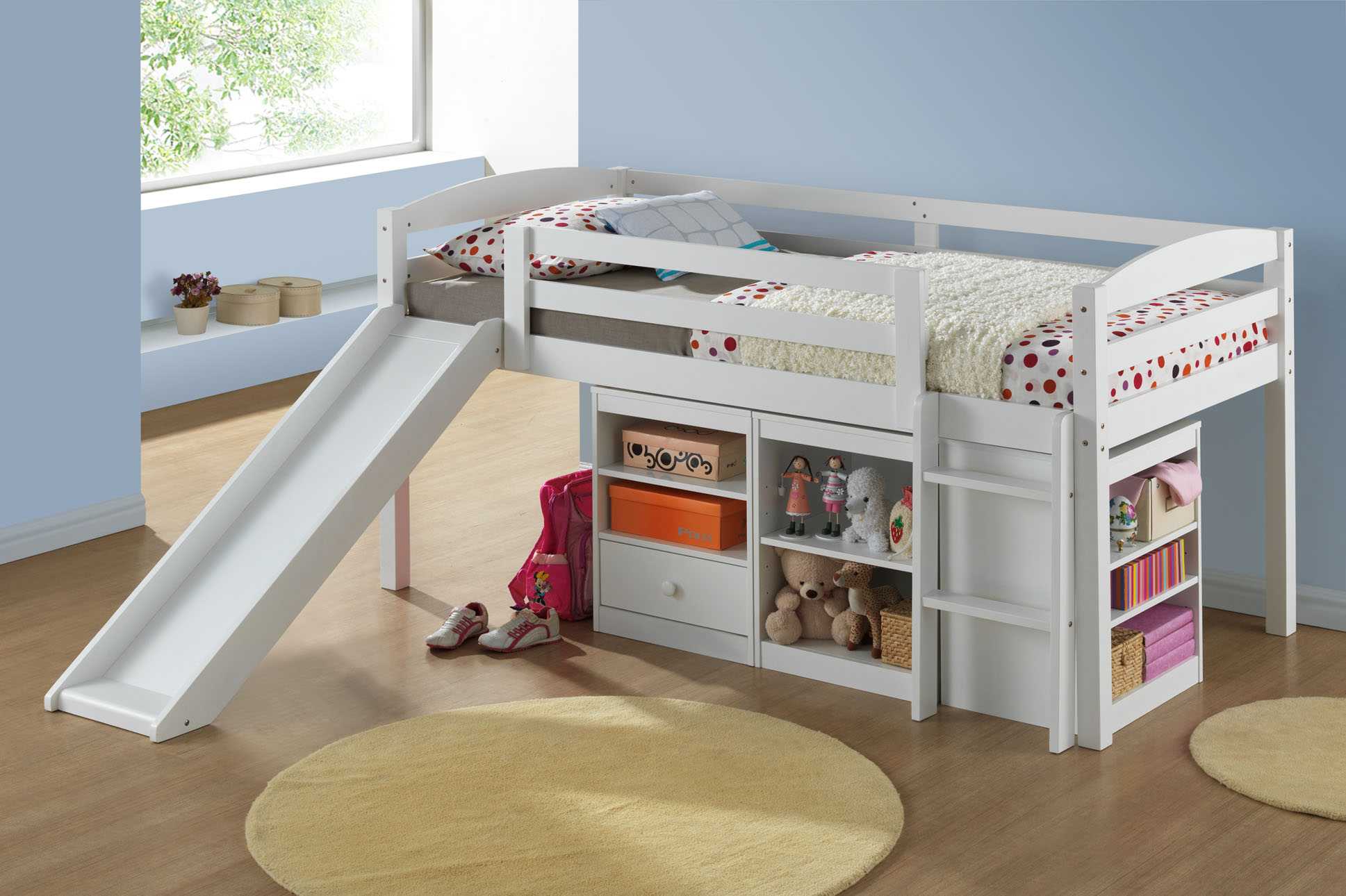 Спальная мебель для детей должна быть ниже, чем для взрослых. Ребенок еще маленький и не может контролировать свои движения во сне – ему легко выпасть из кроватки. Если она снабжена бортиками с перемежающимися планками или прутьями, то они располагаться на среднем расстоянии друг от друга, чтобы малыш не застрял ногой, рукой или головой между ними.