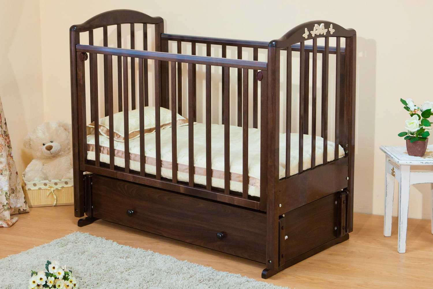 Деревянные кроватки занимают лидирующие позиции, поскольку они самые экологичные и положительно влияют на самочувствие ребенка. Производители используют различные породы дерева, что влияет на итоговую стоимость товара. Наиболее экономичными являются кровати из сосны, березы и ели. Модели из более прочных и долговечных пород (бука, вишни, дуба) обойдутся дороже.