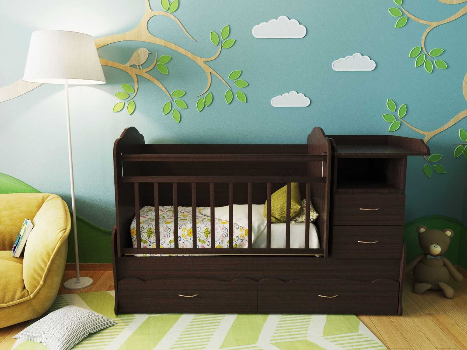 Одним из важнейших критериев выбора кровати — размеры помещения, в котором спит ребенок. Если у него есть отдельная комната большой площади, можно приобрести классическую модель из натурального дерева с пеленальным столиком и комодом в комплекте. Когда малыш спит в родительской спальне, перегруженной предметами мебели, подойдет и маленькая колыбелька.