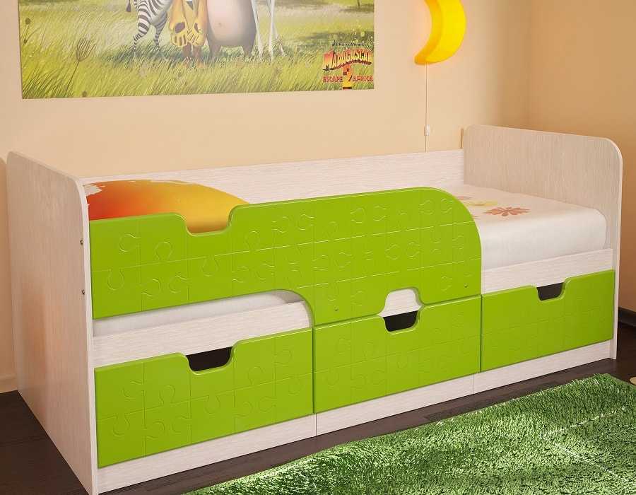 - Кровать с . Выглядит такая модель как односпальная кровать с низким ложем и бортами по краям. Размеры такой кровати: 150х80 или 140х70 сантиметров. Чаще всего такая модель имеет встроенные ящики, которые располагаются под дном кровати. Спинка, бортики и ящики могут быть раскрашены различными рисунками.