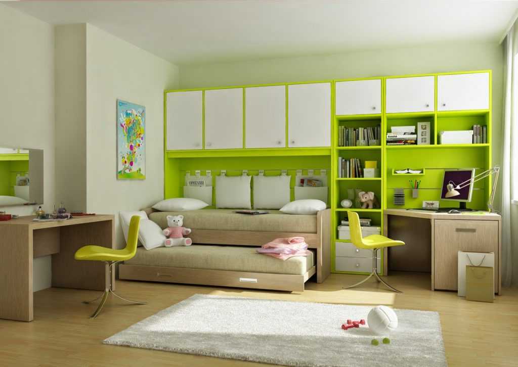 Располагая достаточным количеством свободного места, можно в одном предмете мебели совместить как спальное место, так и рабочее или игровое пространство. Чаще всего, родители активных деток поступают именно таким образом.