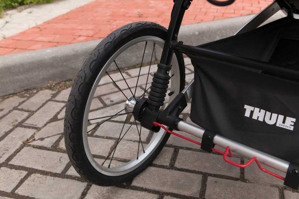 Переднее колесо легко фиксируется кнопкой так, что рук не испачкаешь. Амортизация у колясок Thule Urban Glide и Thule Glide на задних колёсах.