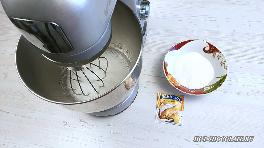 Когда появится пена, в 2 — 3 приёма вводим сахар с ванилином, продолжая взбивать. Время взбивания белков с сахаром у меня составляет 4 — 5 минут. Во время взбивания увеличиваем скорость миксера до максимальной.