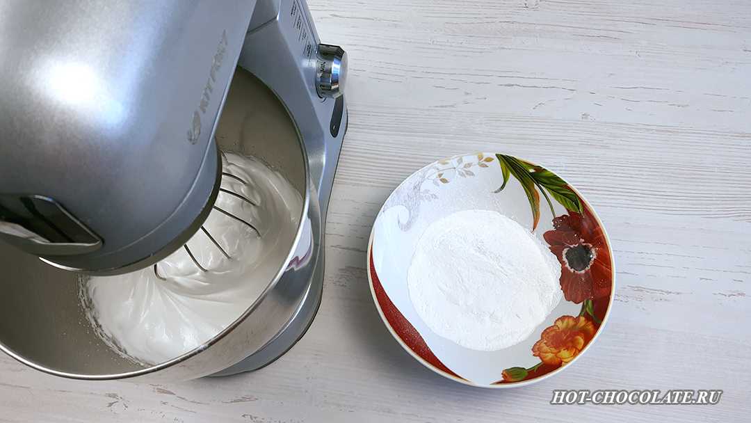 Добавляем в несколько приёмов сахарную пудру и продолжаем взбивать. Я взбиваю ещё 4 — 5 минут. В конце взбивания сахар и сахарная пудра должны полностью раствориться.