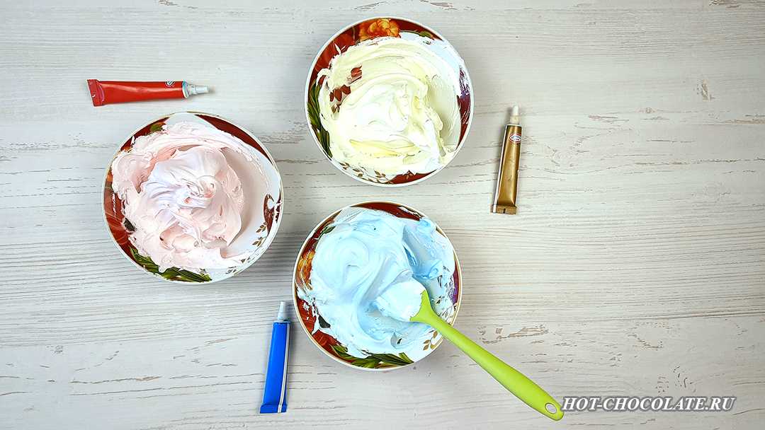При окрашивании меренги в разные цвета её нужно разделить на несколько порций и добавить в каждую порцию 1 — 2 капли красителя и аккуратно перемешать лопаткой до однородного цвета.