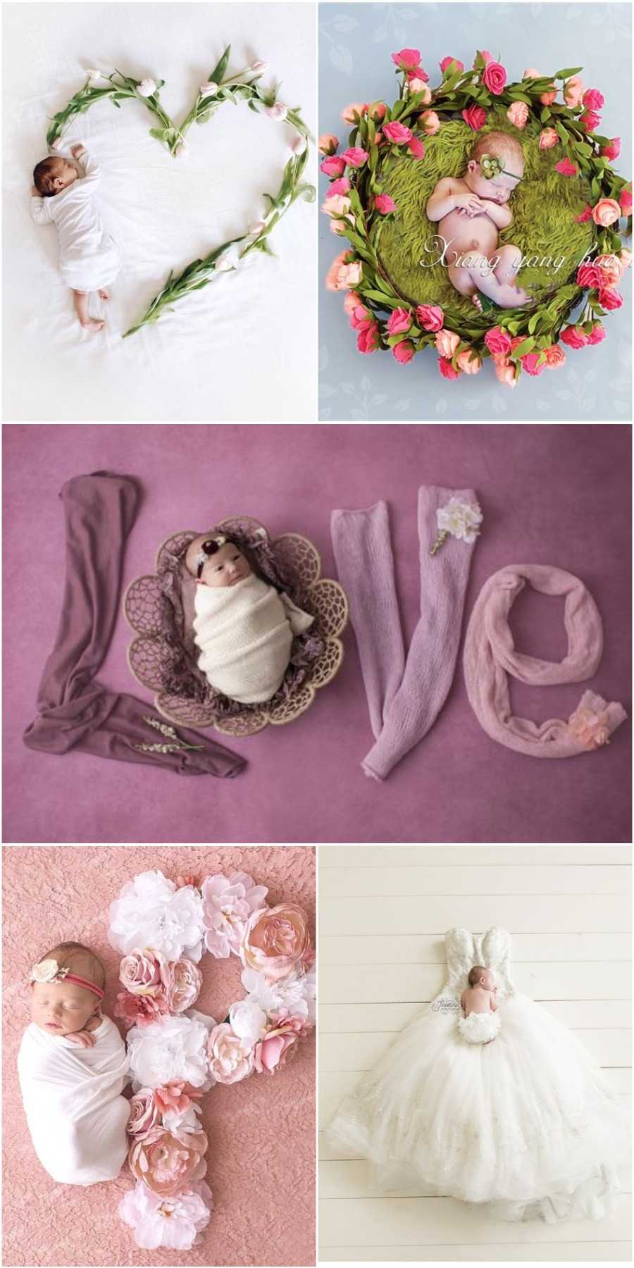 Используйте различный декор в фотосессии для новорожденных девочек. Особенно красиво в кадре смотрятся цветы, как живые так и искусственные (Алиэкспресс). Для фона выбирайте нежные однотонные ткани.