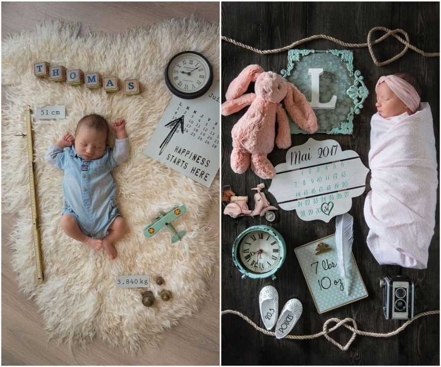 Снимайте кроху на фоне тех вещей, которые имеют для вас особое значение. Например, бабушка связала малышу пинетки, а тетя подарила первую погремушку. Такие предметы можно использовать при создании фото-метрики с важными данными о дне рождении ребенка.