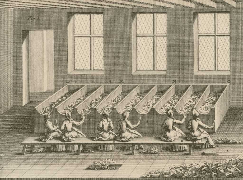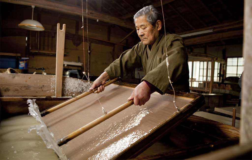 Производилась бумага из сваренного и растолчёного в толкушах тряпья на бумажных мельницах. Это был тяжёлый ручной труд, состоящий из постоянно повторяющихся операций. Мастером — черпальщиком производился ручной отлив каждого листа на сите, потом влажный лист накрывался сукном — это делал валяльщик и на валяльной горке перекатыванием с увеличивающимся давлением отжимал из листа воду. Влажный лист переходил при этом с сетки на сукно, его покрывали вторым сукном. Набиралась стопа таких пирогов из сукон и листов бумаги и эта стопа, она называлась “кладкой”, отжималась на винтовом или гидравлическом прессе. После прессования рабочий -“выметчик” разделял слои бумаги от сукна и укладывал их в стопу. Влажные листы вывешивали для сушки на “вешалах”.