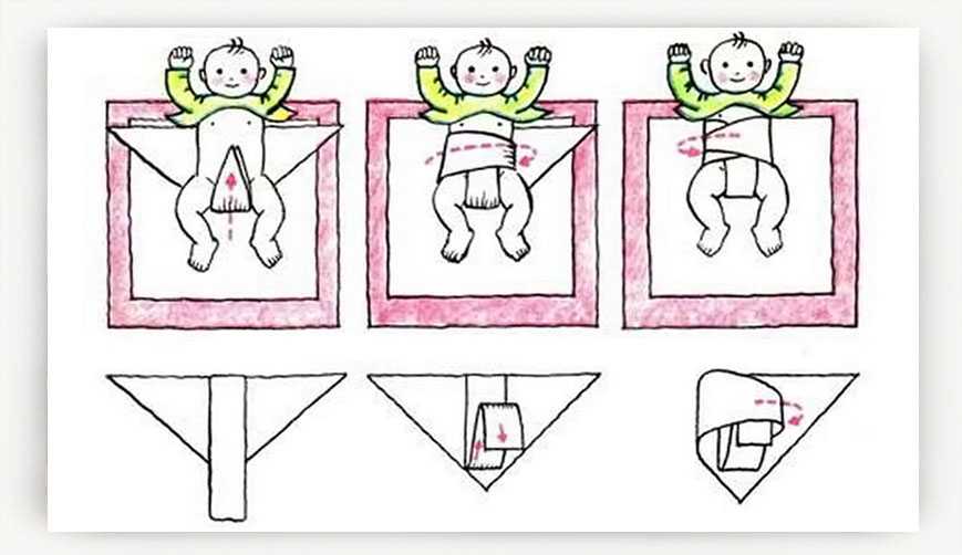 Таким родителям по необходимости приходится задаться вопросом как пеленать новорожденного без подгузника. Такая техника предполагает использование самодельного подгузника вместо покупного. Для ее реализации следует сложить пеленку прямоугольником, а затем квадратом.