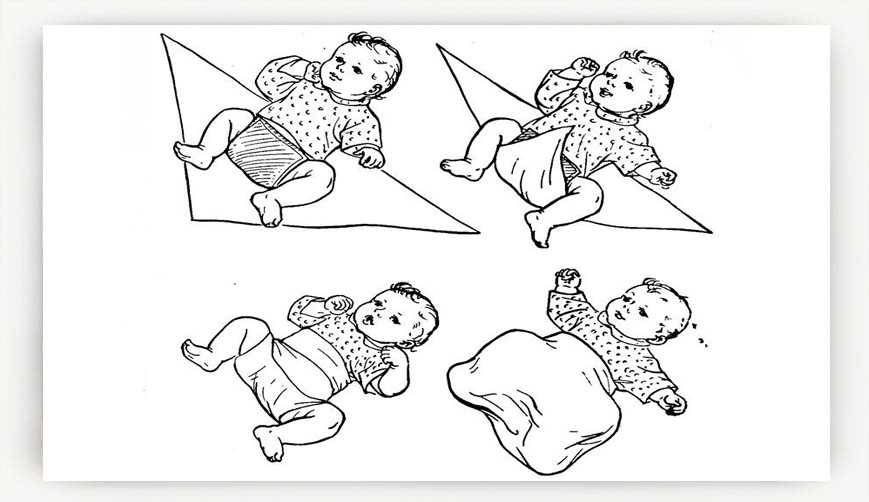 - малыша укладывают так, чтобы голова была немного выше, чем подогнутый край;