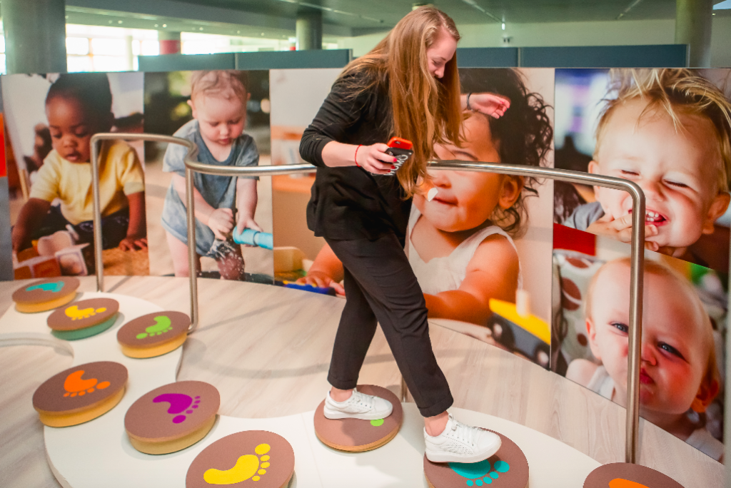 Получив вводные инструкции, мы прошли через большой холл в комнату с круглыми стенами и игрушками. Оказалось, что это комната для вдохновения сотрудников! Они могут приходить сюда и играть, шагать по специальным шатающимся «следам», дабы ощутить то, что чувствует ребенок, делающий первые шаги.