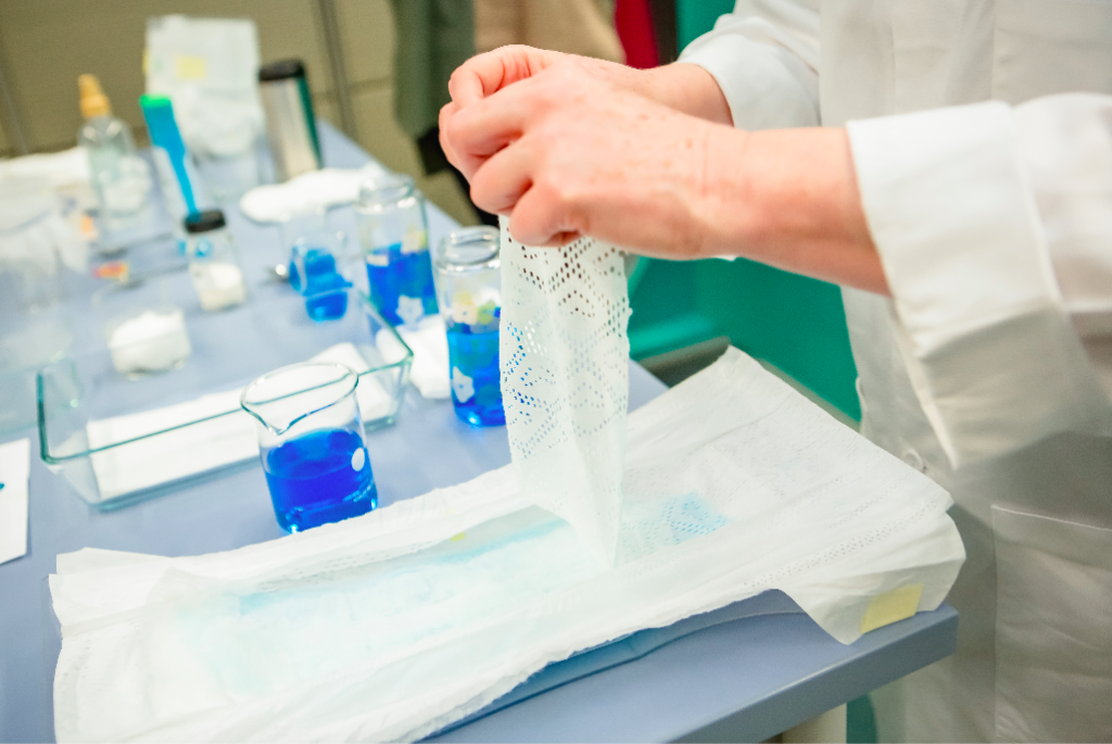 С жидкостями, которые мы видим в рекламе, тоже работают еще в одной лаборатории. Нам демонстрировали несколько экспериментов по впитываемости.