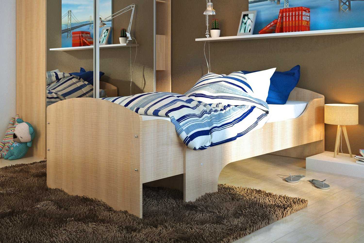 - Стандартная. Односпальная или полутораспальная кровать – универсальный и практичный вариант. Часто такие модели покупают «на вырост». По мере взросления мальчика дизайн комнаты можно несколько раз поменять, нейтральный внешний вид спальной мебели этому не помешает. Но визуальную невыразительность подобного предмета обстановки ребенок может счесть недостатком.