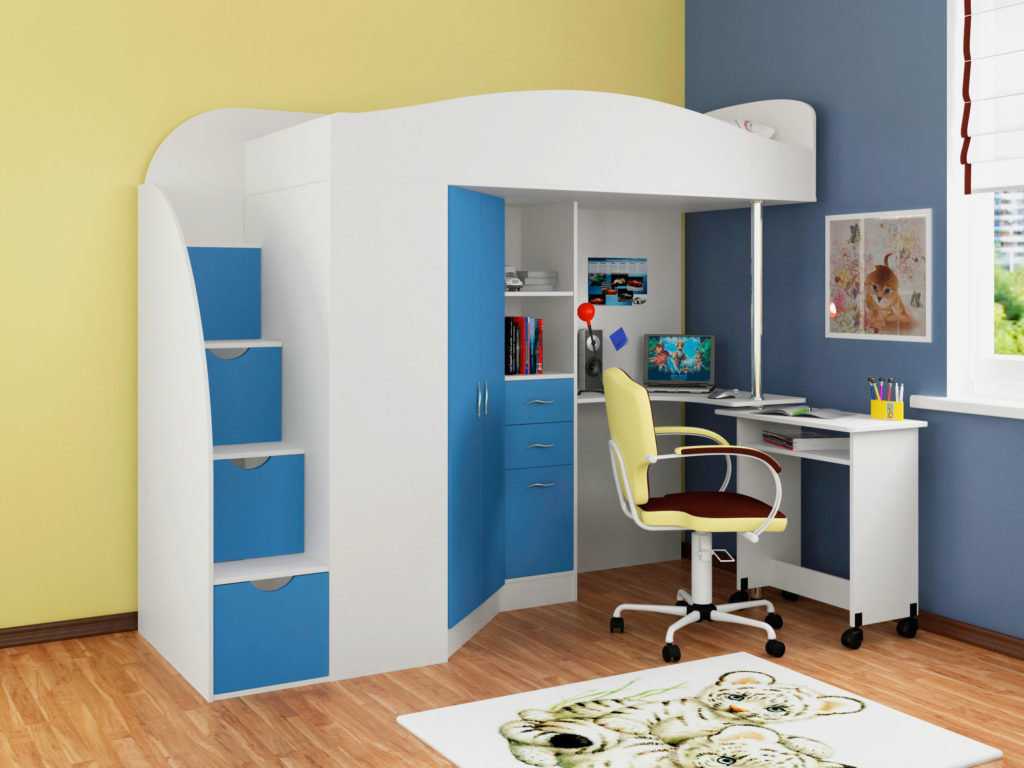 - Кровать-чердак — эти детские кровати от 6 лет мальчики и их родители ценят за оригинальность и экономию места. Ложе для сна располагается на верхнем ярусе конструкции, что позволяет использовать пространство под ним для организации школьного уголка, размещения диванчика или тренажеров, стеллажа для хранения вещей. Но есть и минусы – если ребенок заболел, ему сложно подниматься и спускаться с «чердака».