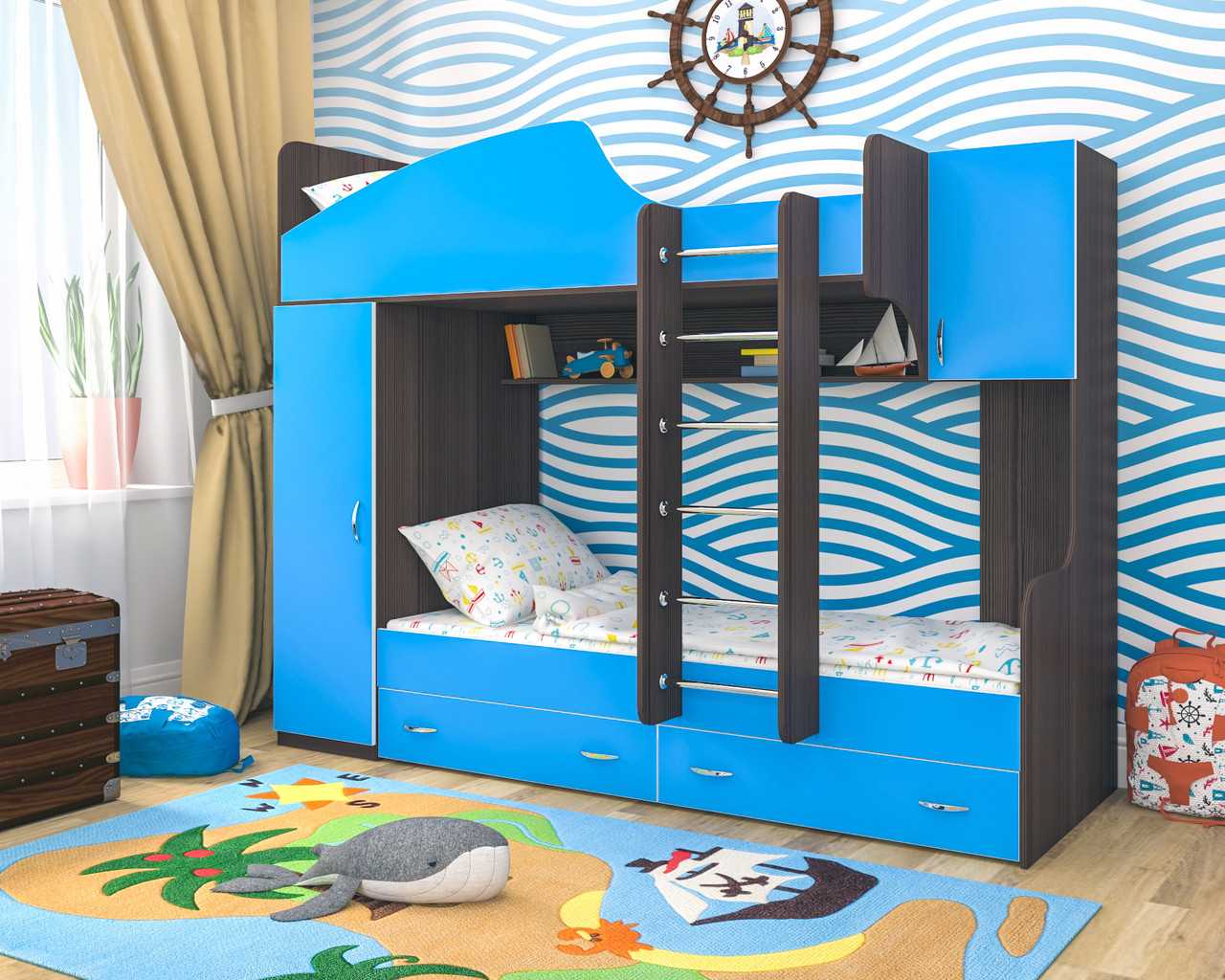 - Двухъярусная. Расположение спальных мест в два яруса – практичное решение, если в семье несколько детей. Двухъярусная кровать с бортиком удобна и безопасна для мальчиков от 4 лет. Модели различаются по оформлению, конструкции, габаритам – лесенка может быть простой вертикальной или выполненной в виде ступенчатого стеллажа. Двухуровневая кровать в морском стиле для мальчиков или кровать-домик станет частью игрового пространства комнаты.