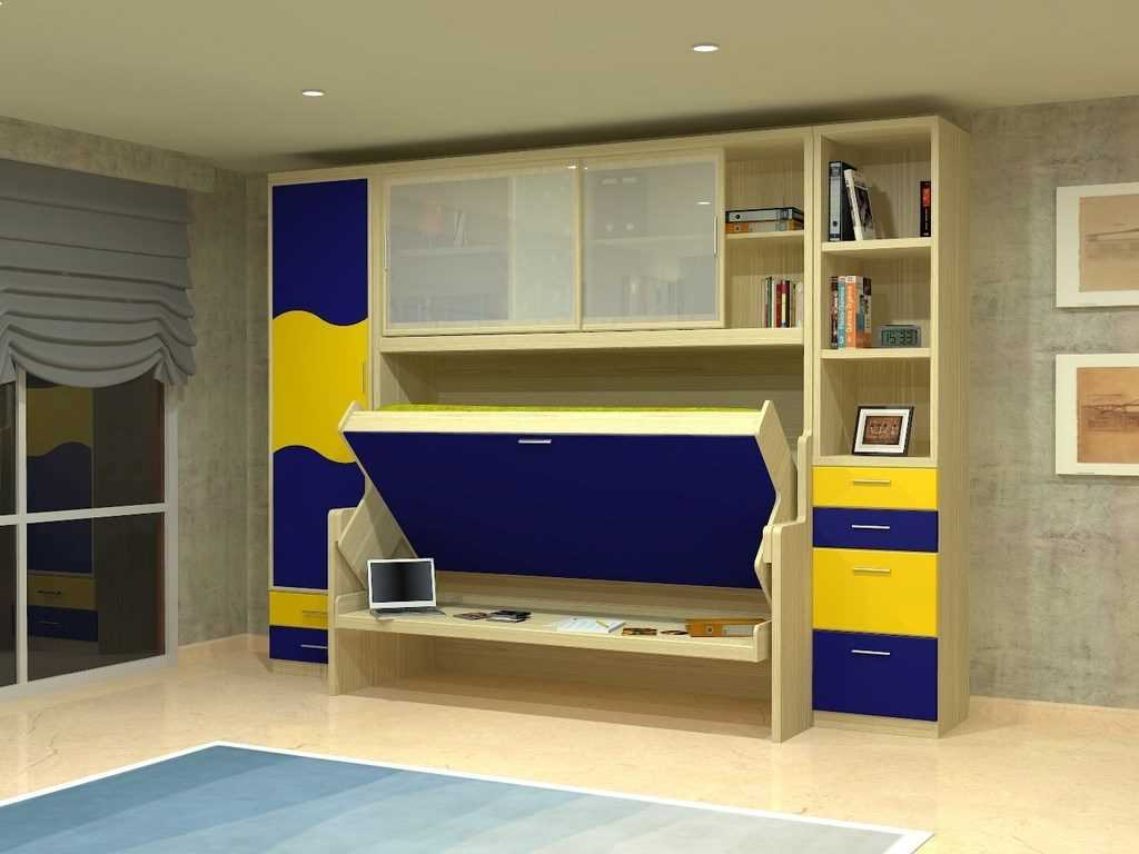 - Еще один вариант, позволяющий экономить пространство, – откидная кровать. В сложенном виде конструкция располагается вертикально, заподлицо с фасадом шкафа или стеллажа. Такую модель по достоинству оценят подростки. К минусам можно отнести неизбежный износ механизма трансформации, сложность использования для детей младшего возраста.