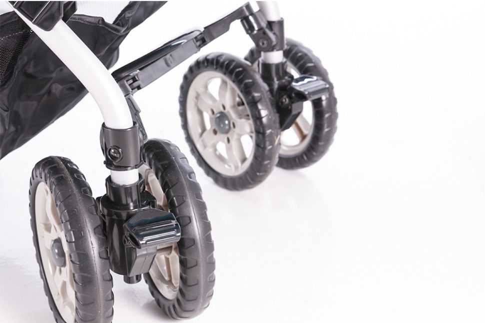 - Материал колес. Надувные колеса улучшают амортизацию и пригодятся если вы планируете гулять по брусчатке или грунтовым дорожкам, но они прибавляют вес коляски, и существует риск проколоть их. Литые пластиковые колеса легкие, их вы не проколете, но и трясти малыша будет прилично даже на малейших неровностях. Промежуточное положение занимают колеса их вспененной резины – они достаточно легки, и немного пружинят, сглаживая тряску.