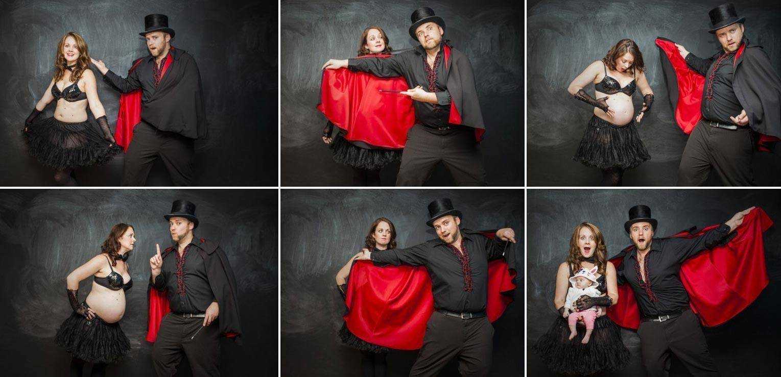 Очень популярны в последнее время фотографии, в которых у родителей «чудесным» образом появляется ребенок. Для такого коллажа необходимо приходить в студию не один раз и фотографировать маму на разных этапах беременности в одной и той же одежде. Но полученный результат стоит таких усилий. Да и каждая мама, глядя на такое фото, будет вспоминать тот «путь», который она проделала, чтобы взять на руки своего кроху.