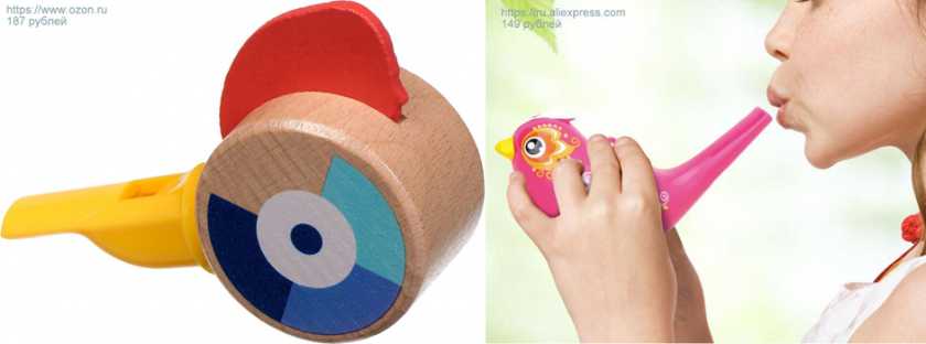 — свистульки – духовой народный инструмент простой геометрической формы, а иногда – в виде какого-либо зверька или птички, порадует малыша уже в первый год жизни. Его устройство до гениального просто: в небольшой камере, путем ее продувания, создаются изящные свистящие и тонкие звуки. С помощью нее можно насвистывать простейшие мелодии, аккомпанировать чтению сказок и конечно – развивать речевое дыхание.
